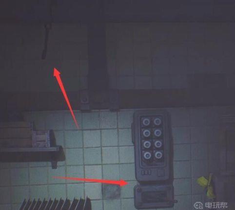 十、向上攀爬后,来到这个隐蔽的房间,里面可以控制上面钩子的转向,将钩子调个方向,然后抓住钩子继续往上,如图所示;
