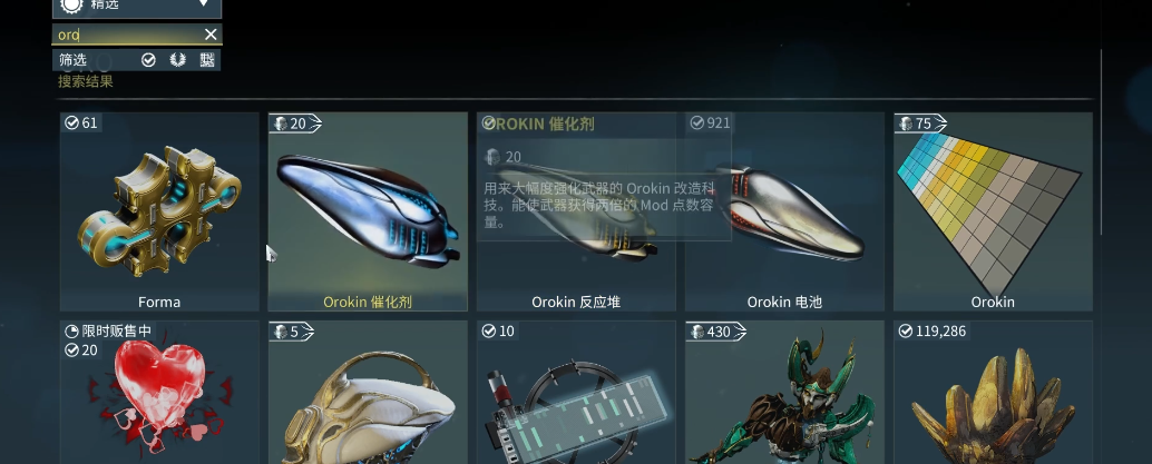 在解决了仓库问题后接下来要考虑的就是怎么让手里的装备变强,这里有对关键道具是奥罗金反应堆和奥罗金催化剂,反应堆用在战甲上而催化剂是用在武器上的,它们能让自己的MOD容量翻倍以便装上更多更强的卡。这东西游戏内能获取但比较慢,直接用白金买能省下大量时间,接着更划算的做法是买福马组合包,在这里买通常比单买要实惠一些。往后还有个福玛Forma,它是用来给装备极化槽位的是后期配卡的核心,这里同样推荐用白金适量购买。