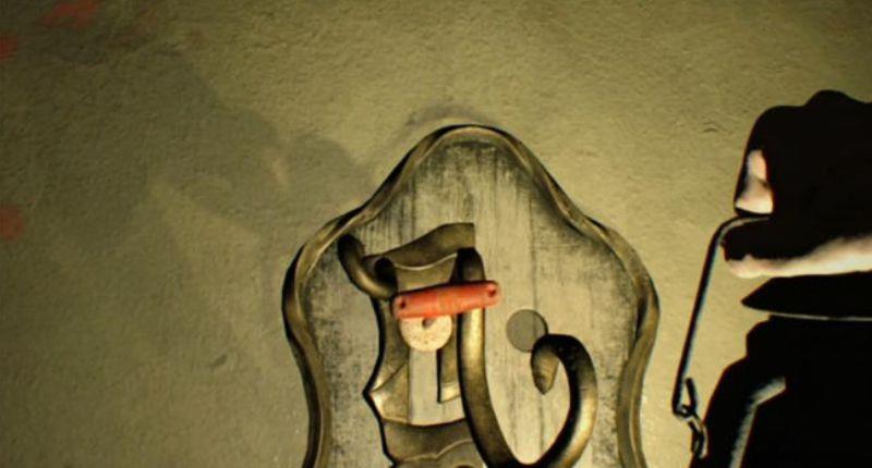 3、回到密码门的房间,那里也有一个相同的架子,使用一样的办法,获得提灯钩子B。使用刀子将贴在投影机上的胶带割开,把提灯放进去形成光源。