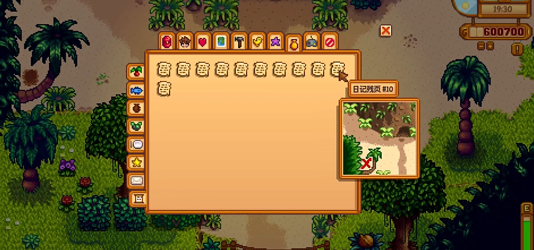 说到这日记残页的内容,那可真不是单纯的收藏品,里面藏着不少实实在好东西。尤其是第4页、第6页和第10页,这三张是关键中的关键,它们各自标记了一个隐藏的宝藏点。你必须得先拿到对应的残页,用锄头去挖指定位置,才能触发宝藏,否则哪怕你站在那个点上挖到地老天荒也啥都没有。比如第4页的线索指向贝啼小屋北边的海岸,第6页在农场下方的蚌区右侧,而第10页则告诉你火山入口外面藏着惊喜。这些宝藏里可能开出金核桃、鸵鸟蛋或者珍珠这类珍贵物品。其他几页残页也各有各的用处,有的会告诉你在东南海岸的洞穴里能钓到黄貂鱼,钓鱼时还可能附带捞上金核桃;有的会透露火山地牢第十层藏着可以给武器附魔的锻造台;还有的会教你怎么用弹弓打落树上的金核桃,可以说是探索姜岛、收集金核桃的必备指南了。
