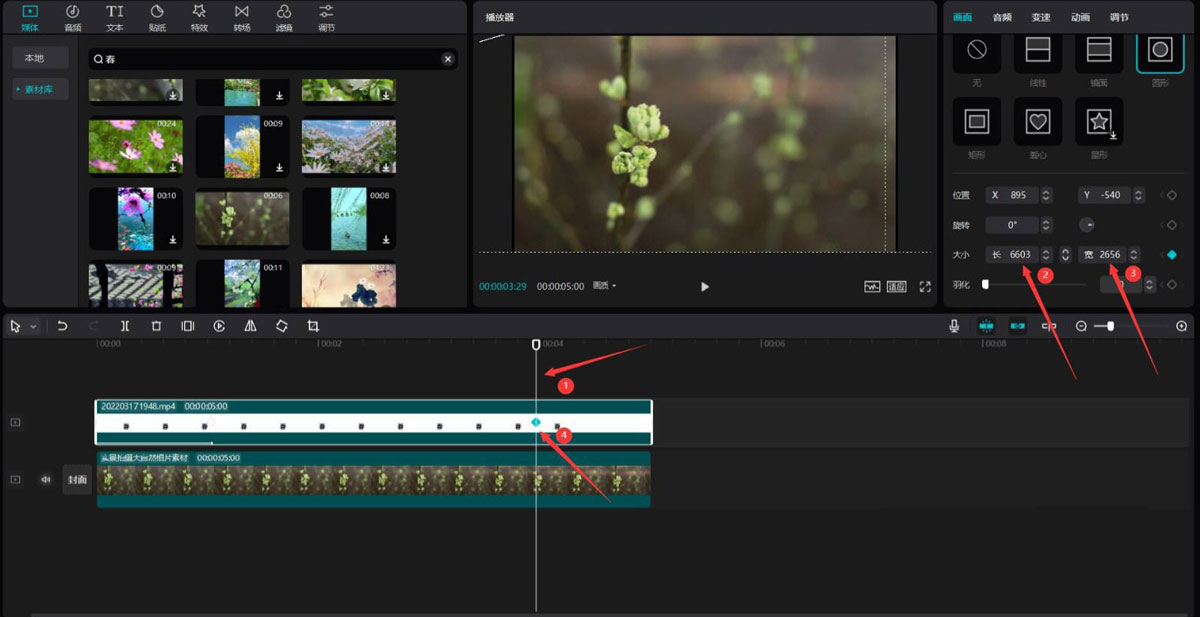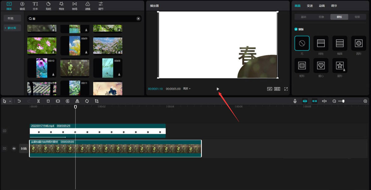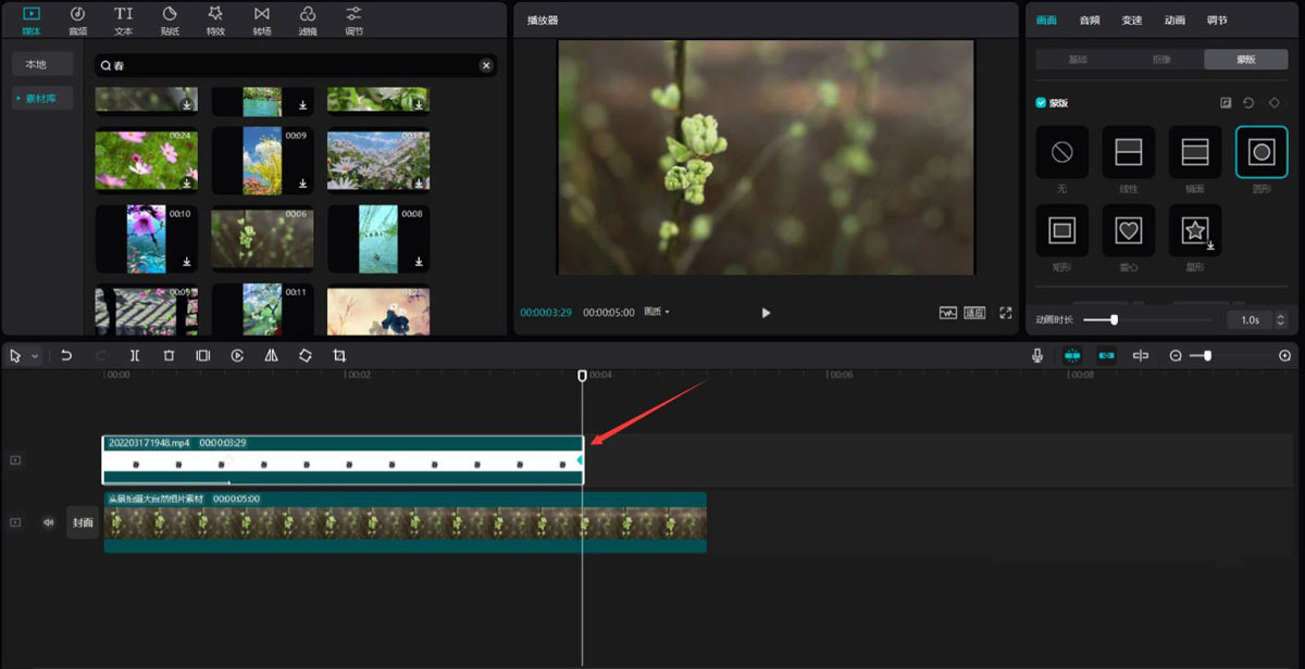 点击素材库按钮,在搜索栏中输入春字,选择一段视频素材,将其添加到视频轨道中。