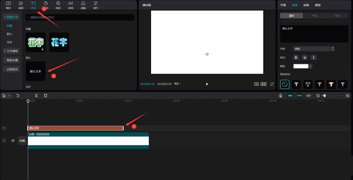 点击文本按钮,选择默认文本,将其添加到文本轨道中,然后调整文本时长为4秒。
