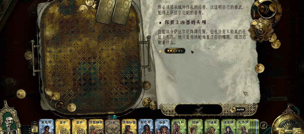 这条线的前期任务主要是帮萨达尔尼处理麻烦,开启事件后通常会有一个为期七天的倒计时任务,里面需要人物独自前往狩猎场。这次狩猎很考验角色的体魄和战斗能力,成功之后会得到一个猎物头颅作为战利品,后面把这个头颅交给萨达尔尼就能推进剧情了。接下来萨达尔尼会向自己提出一个更棘手的请求:她希望自己帮她解决掉她的情夫,也就是银近卫赛里曼。这里是一个重要的分支点,如果选择不杀赛里曼而是去和他谈一谈,那么赛里曼有很大概率会直接背叛苏丹转而为自己所用。